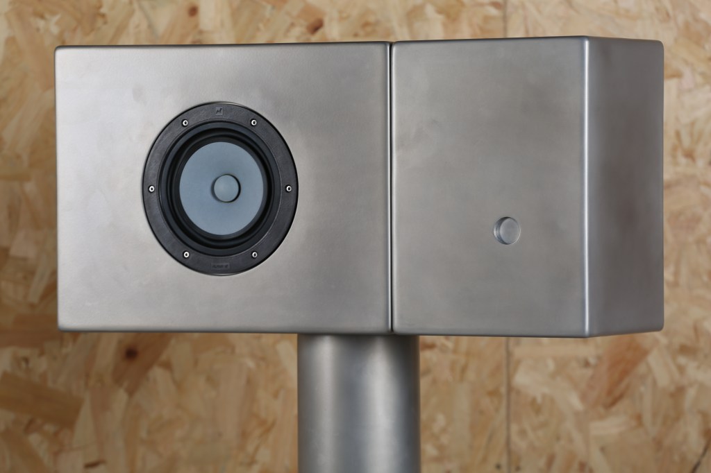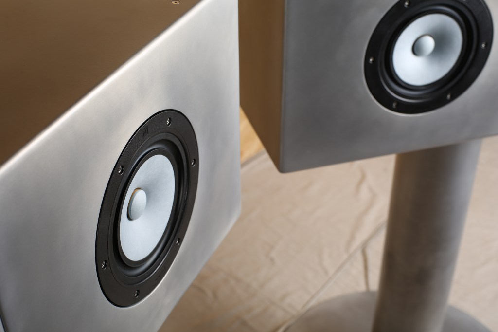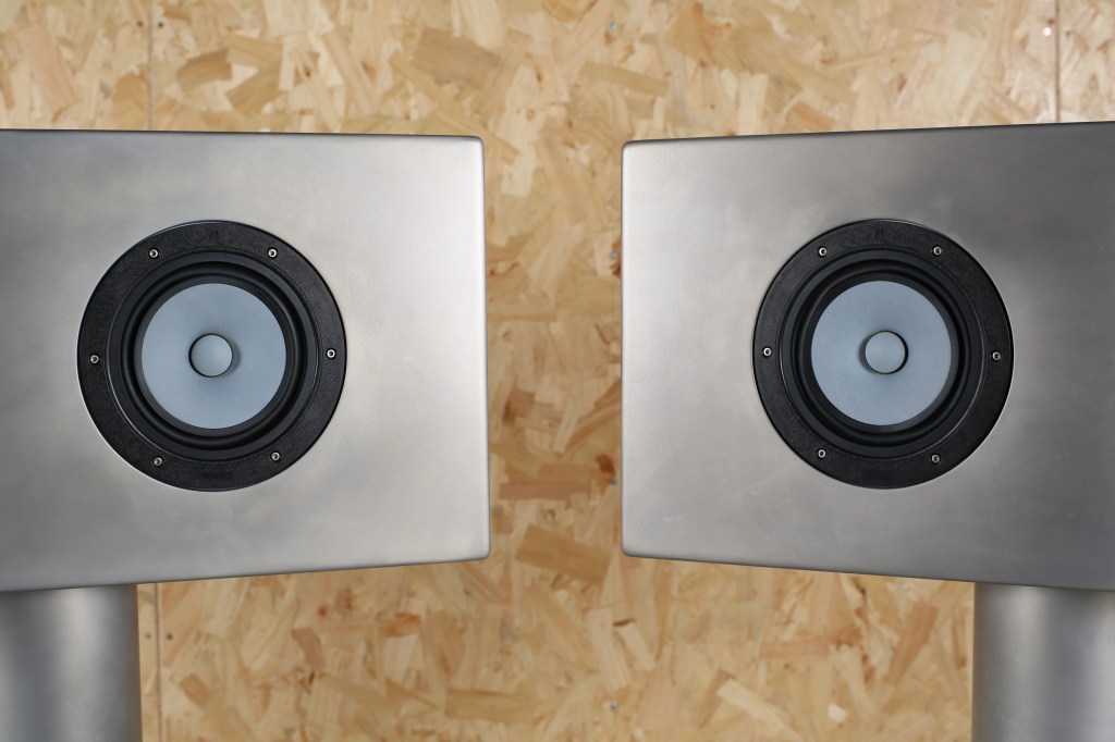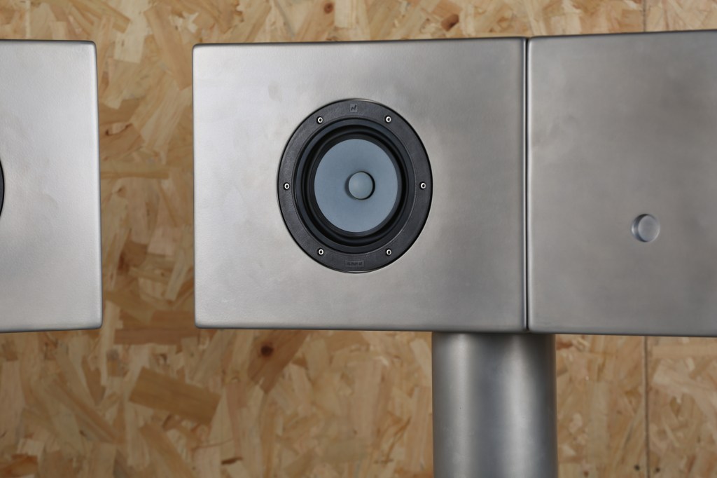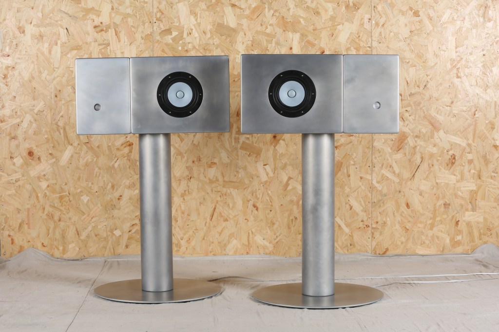 The BF1-H speaker pair is comprised of four separate rectangular forms held firmly by heavy circular tubes. These are destined to hold a stout presence in the room they find themselves all while producing a pleasurable experience aurally.