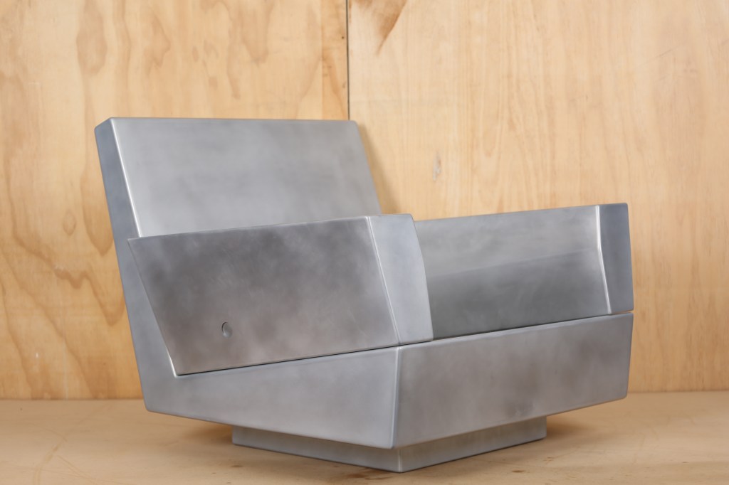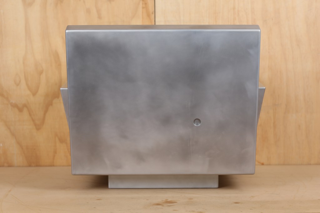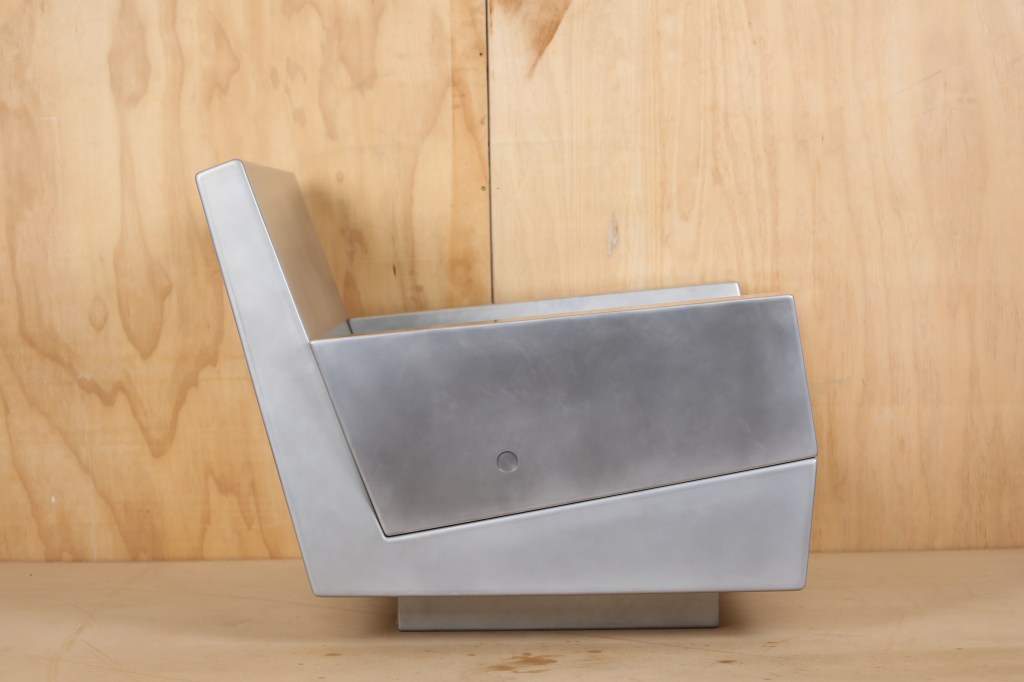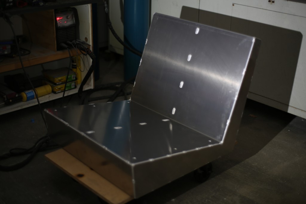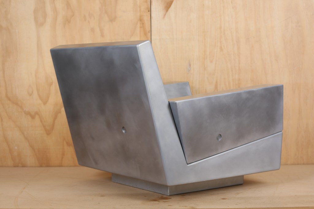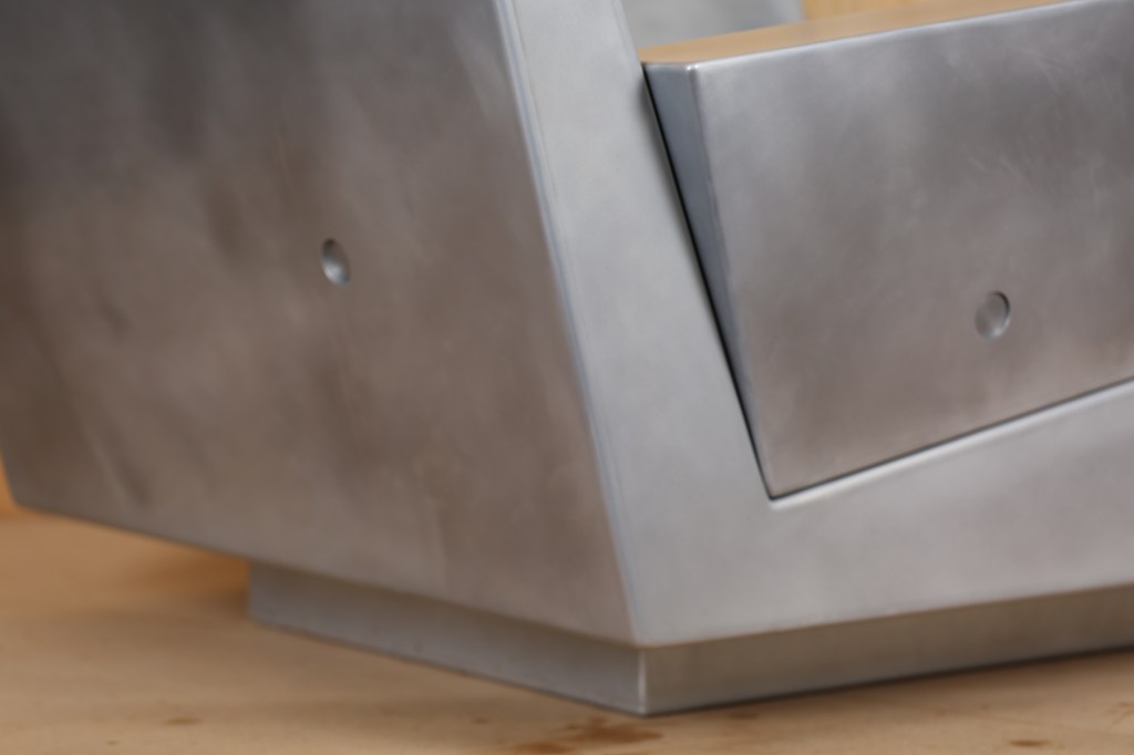The 3D model was altered over the next week with all changes being made to the original concept. Once I was happy with all cut files these were sent away to be processed. The plates arrived at my workshop within a few weeks. My excitement was building when the aluminium plates were sitting on the workbench ready for me to assemble. Before the plates were to come together they required edges to be de-burred and holes chamfered, once this process was done I could move on to prepping edges for welding and tacking plates together in strict order. The next two days was spent under the welding helmet listening to the buzzing sound of the AC tig welder. The welding was slow and methodical with a meditative under current with every dab of filler. Once all of the welding was completed it was now on to the task of linishing the welds to start the metal finishing process. The dirty process of removing the excess weld filler is tedious and requires focus. A subtle angle change of the handheld linisher can result in the base material being gouged past the weld area causing a time consuming job of sanding these marks out before moving through the sanding process any further. A long day was spent linishing the welds down enough ready for the next process. To achieve a straight and clean edge for joining these forms together required me to block sand the welds after linishing, this process alone took 3-4 hours to complete. Next was to use the orbital sander and start by sanding all edges with 80 grit, once the edges were sanded it was just a matter of sanding the rest of the components to a fine 400 grit finish. The smooth and linear aluminium finish I was after requires a high level of attention while sanding to make sure any marks are removed prior to moving up through the grades of sandpaper.